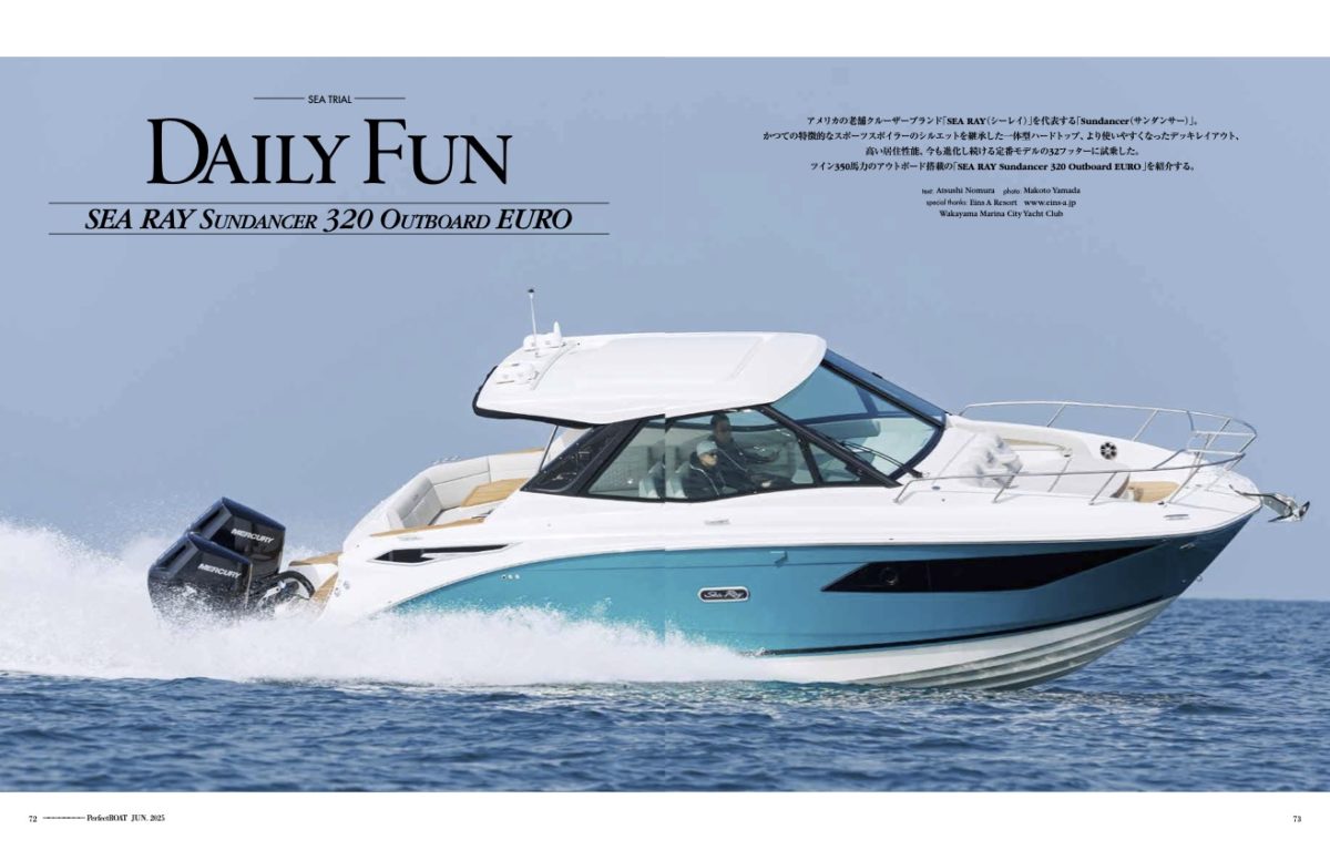 SEA RAY Sundancer 320OEの試乗は和歌山マリーナシティヨット倶楽部をベースに行った。今回の試乗艇のパワートレインは、MERCURYVerado350のツイン・アウトボード搭載。コンディションは小波がある程度で32フィート艇にとってはほぼフラットな状況。桟橋を離れてデッドスローで港内を進む。低速域でのジョイスティックによるコントロール、特に離着岸時に真横へ移動するのは何度試しても本当に便利だ。港外へ出て徐々に加速していく。ハンプを感じることなくスムーズにプレーニングする。4,500rpm程度まで上げるとクルージングスピードである30ktに達する。左舷のウォークスルーのドアを閉めた状態だとほぼ風が当たらないため、スピード感は驚くほど感じられない。引き続き加速を続けてマックスへ。スロットルを目一杯倒すと、42ktをマーク。さらにトリムをコントロールして6,500rpmまで回すとこの日の最高速である45ktをマークした。再びクルージングスピードに落として旋回性能のテストを行う。やはり個人的にSundancerはこのくらいのサイズが良い。実に旋回が愉しいのだ。スラロームを繰り返しても適度な傾きで曲がっていくため「怖さ」は無いし、とても姿勢が安定している。自船で立てた引き波に当たってもスパッと切るし衝撃もソフト。Sundancerにはボートを走らせること自体の愉しみが間違いなくある。実は2年前に同型艇のMERCURY Verado 250のトリプル・アウトボード仕様にも試乗している(弊誌2024年2月号掲載)が、トリプル250馬力のマックススピードは47ktであり、2ktほど今回の方が低い。ただし取り回しのしやすさや、クルージングスピードでの旋回性能はツイン350馬力の方が上回っているように思うし、走らせての愉しさはさらに増しているようにも思う。おそらく安定感で言えばスターンドライブ仕様も選択肢に入るだろうが、このボートの走らせて愉しむと言う本質の部分を考えるとアウトボード仕様は非常に魅力的だと思う。