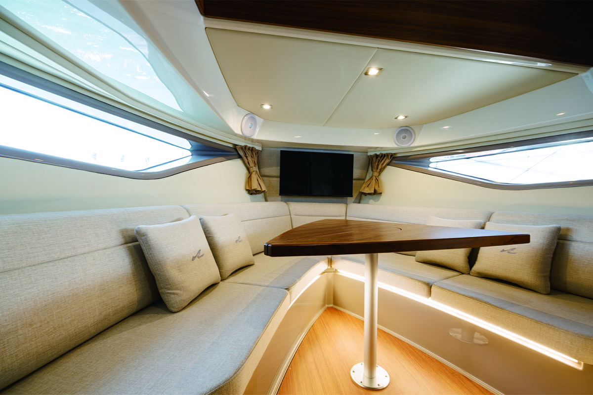 デッキレイアウトは近年のエクスプレスクルーザーらしいレイアウトだ。大型スイミングプラットフォームの右舷にトランサムゲート。アフトコクピット左舷に大型L字ソファがあり、その前部はバックトゥバックの背もたれとなる。右舷にソファとカウンター(コンロ・シンク装備)が並ぶ。デュアルのドライバーズシートとヘルムステーションは前寄り右舷に配置されている。フォアデッキへは前部左舷側のウォークスルーからアクセス可能。従来よりも高さのあるフォアデッキにはサンベッドとしても使える3連シートが並んでいる。ヘルムステーションの左側のドアからロアフロアへ。ロアフロアは、Vバースとなるフォアキャビン、ツインおよびダブルに可変なベッドを配置したミッドキャビン、個室ヘッドが並ぶ。高さのある室内でステイにも対応する。