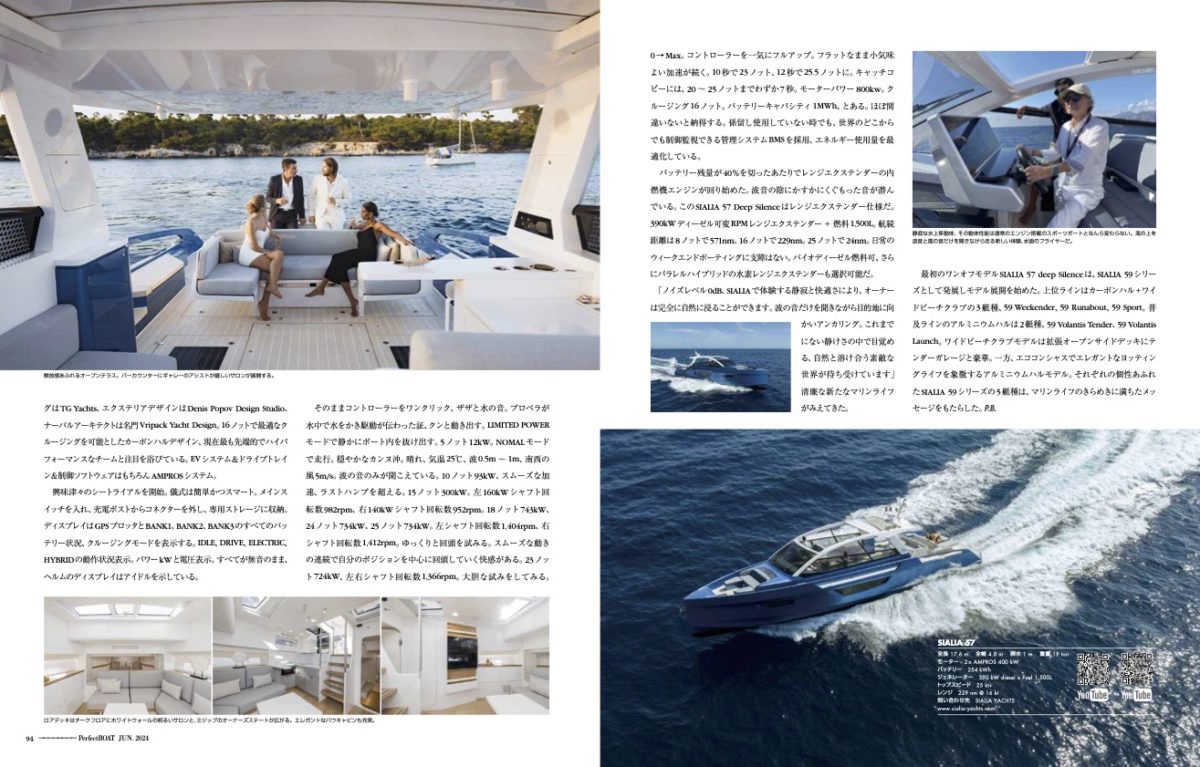 このプロトタイプというべき「SIALIA 57 Deep Silence」のデビューは2022年。発表されたスペックは全長17.6m、全幅4.8m、ドラフト1m。EVパワー2×AMPROS 400kW、バッテリー254kWh。ACチャージ22kW、DC急速150kW。マテリアル、カーボンファイバー。トップスピード25ノット、クルージング16ノット。航続距離229nm@16ノット。エンジニアリングはTG Yachts、エクステリアデザインはDenis Popov Design Studio、ナーバルアーキテクトは名門VripackYachtDesign。16ノットで最適なクルージングを可能としたカーボンハルデザイン、現在最も先端的でハイパフォーマンスなチームと注目を浴びている。EVシステム&ドライブトレイン&制御ソフトウェアはもちろんAMPROSシステム。
