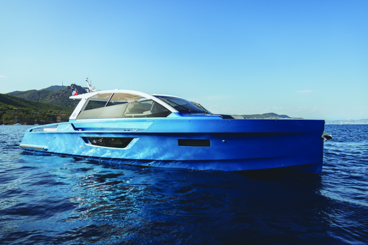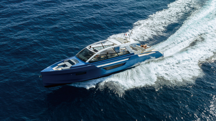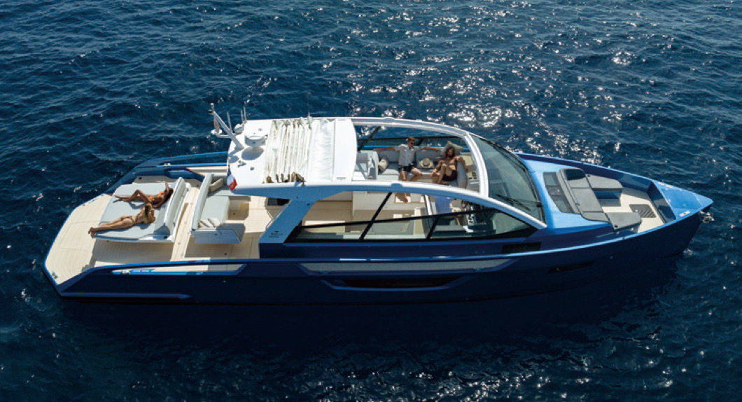 スイミングプラットフォームから直立ステムのバウに向けて伸びあがり流れていくシアーライン。ブルーハルに開けられた中空のブルワークウィンドウ、ブラックアウトされたハルサイドの異形ひし形ウィンドウ。フロントスクリーンにつながるサイドウィンドウ。スポーティーなオープンフォルムにホワイトのルーフが覆いかぶさるように組み上げられている。ルーフの60%は開閉可能なキャンバストップ、採光は意のまま。