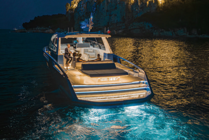 スイミングプラットフォームから2段上がった淡いチークの張り込められたメインデッキは、ウォークアラウンドでバウのラウンジデッキに至る。アフトコクピットには広々としたサンベッドが置かれ、前方にはコの字シートが用意され、左舷にはバーカウンターのあるオープンギャレーのウェットバーユニットがウェルカムモードになっている。右舷にはロングチェア、その前はヘルムステーション。左舷にはコの字ソファがセットされ、充実したエンターテインメントゾーンとなる。
