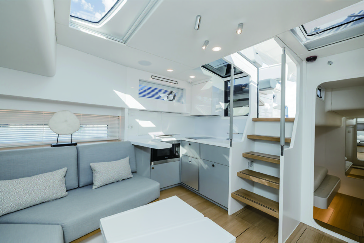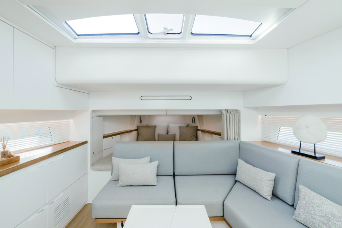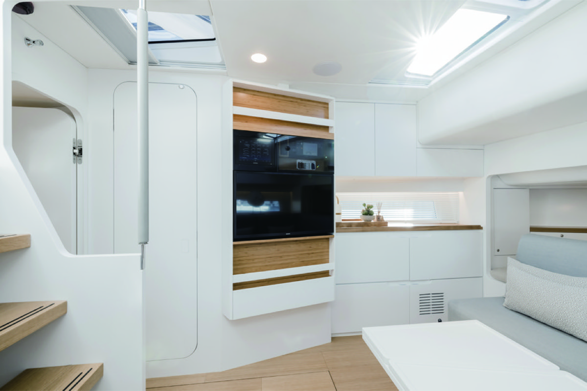 ロアデッキへはヘルム中央からコンパニオンウェイを5段降りる。チークフロアの淡いブラウンに薄い青の混ざったオフホワイトのウォール、明るい北欧の面持ちあふれたモダンリビングが広がる。右舷にL字ソファ、左舷にギャレーが潜むロアサロン、バウにはダブルベッドのVバースが現れる。ミジップにはアイランドタイプのベッド、クローゼット、パウダールームのオーナーズステートが用意される。刺激的な色や造形物のない心地よさが支配する空間が演出され、広がりを見せている。