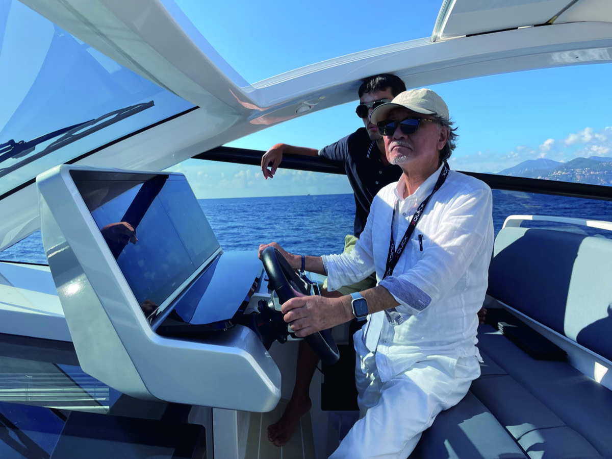 ヘルムステーションの構成は、コンソール正面に2面の21インチディスプレイ、もちろんタッチセンサー。左ディスプレイにはEVバッテリー状況、パワープラントモーターモニター、ドライブ状況表示モニターが位置する。右ディスプレイは通常のGPSプロッタ。眼前にステアリングホイール、その右手に2軸のモーターコントローラー、ジョイスティック、バウスラスターが整然と並んでいる。ステアリングスポークには音響、ワイパー、トリム等のスイッチがある。ヘルムシートは二人掛けのタンデムシート。インスツルメントパネルの表示を見なければ、このボートがEV艇であることの認識は持てない。静かにジャズの流れるモダンで美しいウィークエンダーボートなのだから。