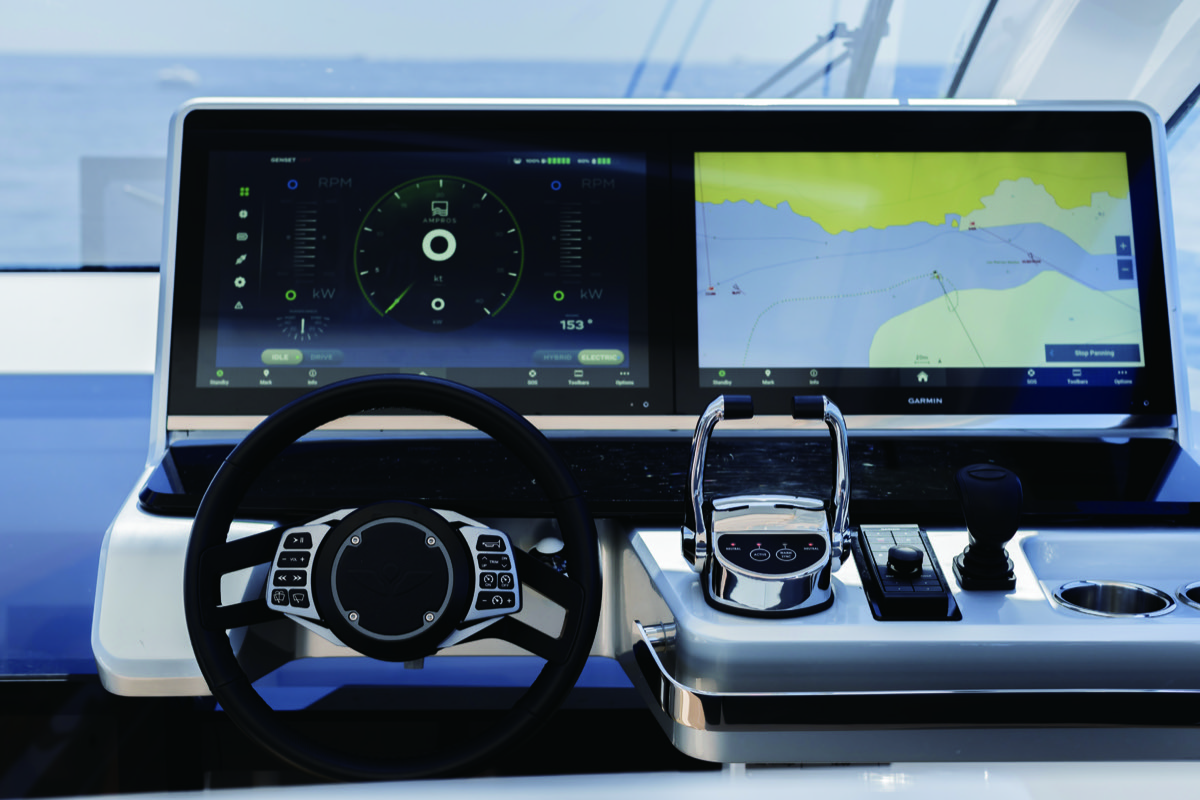 興味津々のシートライアルを開始。儀式は簡単かつスマート。メインスイッチを入れ、充電ポストからコネクターを外し、専用ストレージに収納。ディスプレイはGPSプロッタとBANK1、BANK2、BANK3のすべてのバッテリー状況、クルージングモードを表示する。IDLE、DRIVE、ELECTRIC、HYBRIDの動作状況表示。パワーkWと電圧表示。すべてが無音のまま、ヘルムのディスプレイはアイドルを示している。