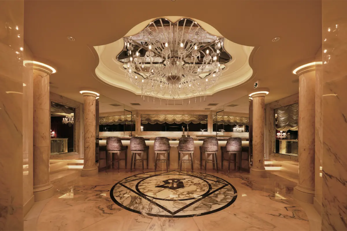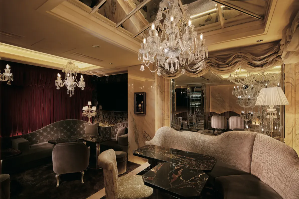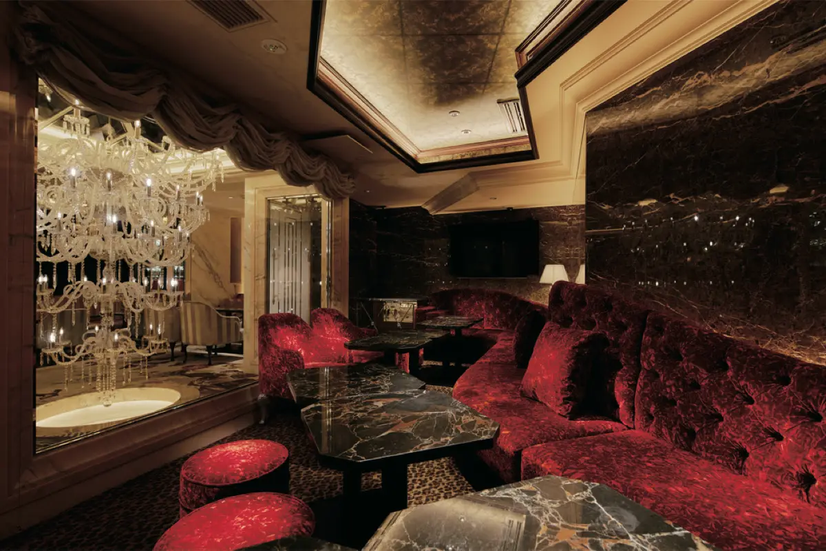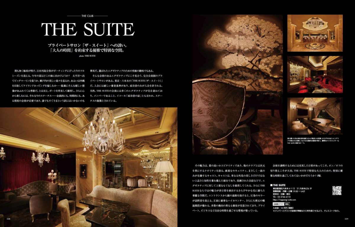 その魅力は、質の高いホスピタリティであり、他のクラブとは次元を異にするクオリティを誇る。厳重なセキュリティ、まさしく一流のみが在籍するキャスト。キャストは、単なる外見の美しさだけではない上品さと知性を兼ね備えた淑女であり、洗練された会話などで、エグゼクティブに対して上質なもてなしを提供してくれる。さらにTHE SUITEならではの魅力が非日常を演出するきらびやかな光に満ちた華麗な空間だ。エントランスから鏡の通路を抜けると、圧巻のセラーが訪問者を迎える。正面に豪華なハイカウンター、さらに大理石の螺旋階段が備わる。多数の趣向の異なる個室が用意されており、プライベート、ビジネスなど自由な時間を過ごせる環境が整っている。